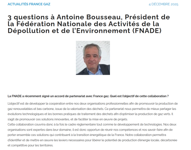 Antoine Bousseau, Président de la FNADE, rappelle les objectifs et les enjeux de la production de gaz renouvelables et bas carbone issus de la valorisation des déchets, dans la newsletter de France Gaz.